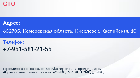 СТО по адресу 652705, Кемеровская область, Киселёвск, Каспийская, 10 в дальнейшем Организация, размещена в следующих категориях: