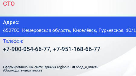 СТО по адресу 652700, Кемеровская область, Киселёвск, Гурьевская, 10/1 в дальнейшем Организация, размещена в следующих категориях: