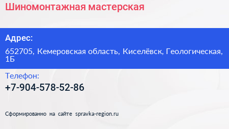 Шиномонтажная мастерская по адресу 652705, Кемеровская область, Киселёвск, Геологическая, 1Б в дальнейшем Организация, размещена в следующих категориях:
