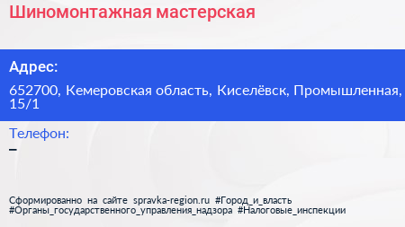 Шиномонтажная мастерская по адресу 652700, Кемеровская область, Киселёвск, Промышленная, 15/1 в дальнейшем Организация, размещена в следующих категориях: