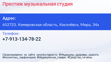 Престиж, музыкальная студия по адресу 652723, Кемеровская область, Киселёвск, Мира, 34а в дальнейшем Организация, размещена в следующих категориях: