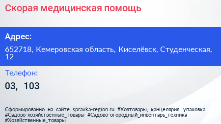 Скорая медицинская помощь по адресу 652718, Кемеровская область, Киселёвск, Студенческая, 12 в дальнейшем Организация, размещена в следующих категориях: