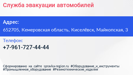 Служба эвакуации автомобилей по адресу 652705, Кемеровская область, Киселёвск, Майкопская, 3 в дальнейшем Организация, размещена в следующих категориях: