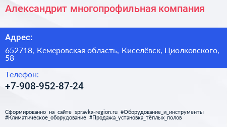 Александрит, многопрофильная компания по адресу 652718, Кемеровская область, Киселёвск, Циолковского, 58 в дальнейшем Организация, размещена в следующих категориях: