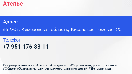 Ателье по адресу 652707, Кемеровская область, Киселёвск, Томская, 20 в дальнейшем Организация, размещена в следующих категориях: