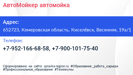 АвтоМойкер, автомойка по адресу 652723, Кемеровская область, Киселёвск, Весенняя, 19а/1 в дальнейшем Организация, размещена в следующих категориях: