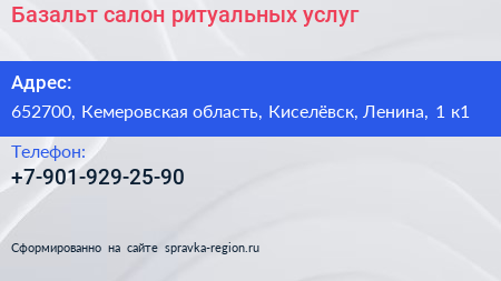 Базальт, салон ритуальных услуг по адресу 652700, Кемеровская область, Киселёвск, Ленина, 1 к1 в дальнейшем Организация, размещена в следующих категориях: