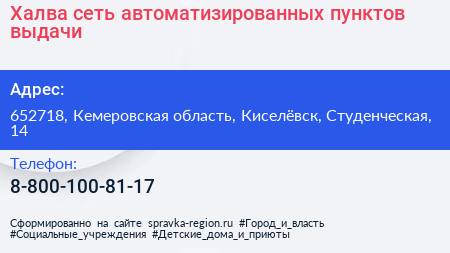 Халва, сеть автоматизированных пунктов выдачи по адресу 652718, Кемеровская область, Киселёвск, Студенческая, 14 в дальнейшем Организация, размещена в следующих категориях: