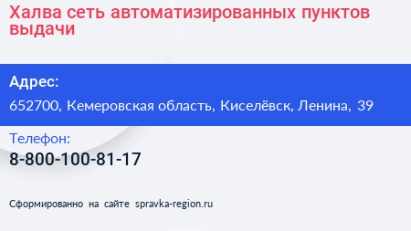 Халва, сеть автоматизированных пунктов выдачи по адресу 652700, Кемеровская область, Киселёвск, Ленина, 39 в дальнейшем Организация, размещена в следующих категориях: