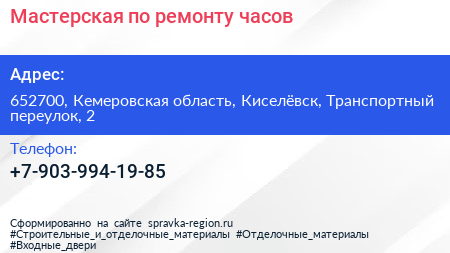 Мастерская по ремонту часов по адресу 652700, Кемеровская область, Киселёвск, Транспортный переулок, 2 в дальнейшем Организация, размещена в следующих категориях: