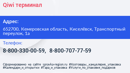 Qiwi, терминал по адресу 652700, Кемеровская область, Киселёвск, Транспортный переулок, 1а в дальнейшем Организация, размещена в следующих категориях: