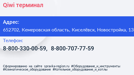 Qiwi, терминал по адресу 652702, Кемеровская область, Киселёвск, Новостройка, 13 в дальнейшем Организация, размещена в следующих категориях: