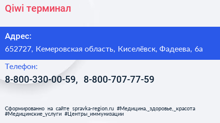 Qiwi, терминал по адресу 652727, Кемеровская область, Киселёвск, Фадеева, 6а в дальнейшем Организация, размещена в следующих категориях: