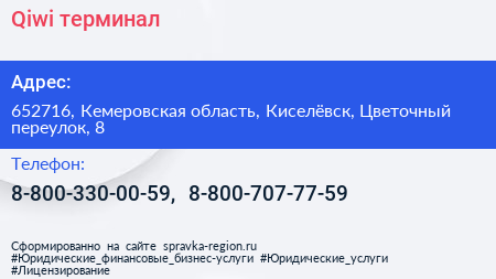 Qiwi, терминал по адресу 652716, Кемеровская область, Киселёвск, Цветочный переулок, 8 в дальнейшем Организация, размещена в следующих категориях:
