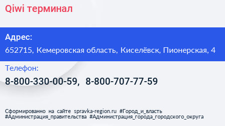 Qiwi, терминал по адресу 652715, Кемеровская область, Киселёвск, Пионерская, 4 в дальнейшем Организация, размещена в следующих категориях: