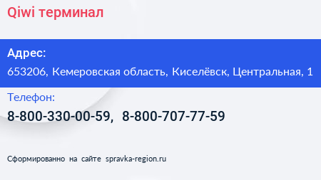 Qiwi, терминал по адресу 653206, Кемеровская область, Киселёвск, Центральная, 1 в дальнейшем Организация, размещена в следующих категориях:
