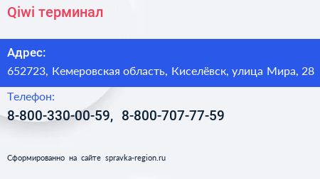 Qiwi, терминал по адресу 652723, Кемеровская область, Киселёвск, улица Мира, 28 в дальнейшем Организация, размещена в следующих категориях: