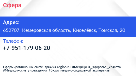 Сфера по адресу 652707, Кемеровская область, Киселёвск, Томская, 20 в дальнейшем Организация, размещена в следующих категориях:
