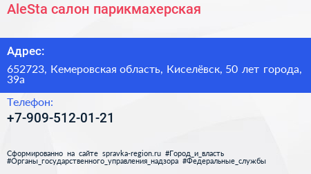 AleSta, салон-парикмахерская по адресу 652723, Кемеровская область, Киселёвск, 50 лет города, 39а в дальнейшем Организация, размещена в следующих категориях: