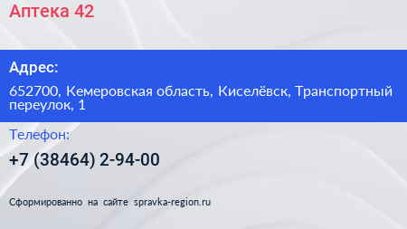 Аптека 42 по адресу 652700, Кемеровская область, Киселёвск, Транспортный переулок, 1 в дальнейшем Организация, размещена в следующих категориях: