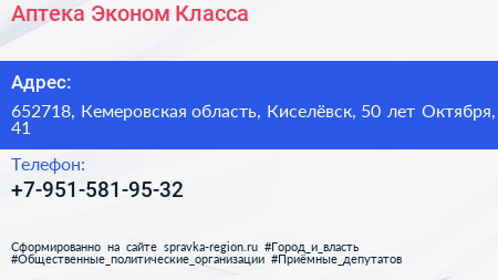 Аптека Эконом Класса по адресу 652718, Кемеровская область, Киселёвск, 50 лет Октября, 41 в дальнейшем Организация, размещена в следующих категориях: