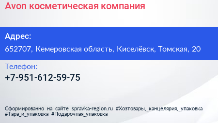 Avon, косметическая компания по адресу 652707, Кемеровская область, Киселёвск, Томская, 20 в дальнейшем Организация, размещена в следующих категориях: