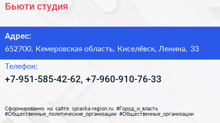 Бьюти-студия по адресу 652700, Кемеровская область, Киселёвск, Ленина, 33 в дальнейшем Организация, размещена в следующих категориях: