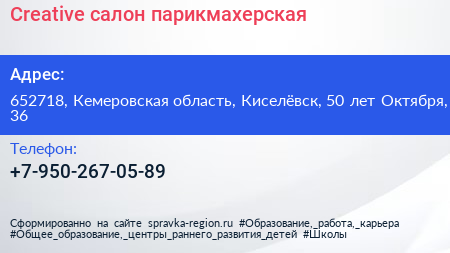 Creative, салон-парикмахерская по адресу 652718, Кемеровская область, Киселёвск, 50 лет Октября, 36 в дальнейшем Организация, размещена в следующих категориях: