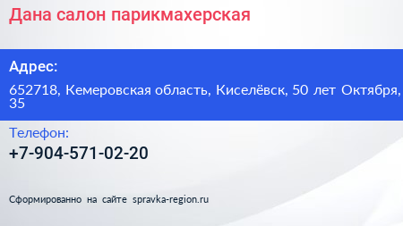 Дана, салон-парикмахерская по адресу 652718, Кемеровская область, Киселёвск, 50 лет Октября, 35 в дальнейшем Организация, размещена в следующих категориях: