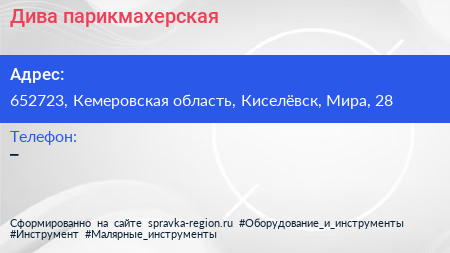 Дива, парикмахерская по адресу 652723, Кемеровская область, Киселёвск, Мира, 28 в дальнейшем Организация, размещена в следующих категориях: