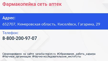 Фармакопейка, сеть аптек по адресу 652707, Кемеровская область, Киселёвск, Гагарина, 29 в дальнейшем Организация, размещена в следующих категориях: