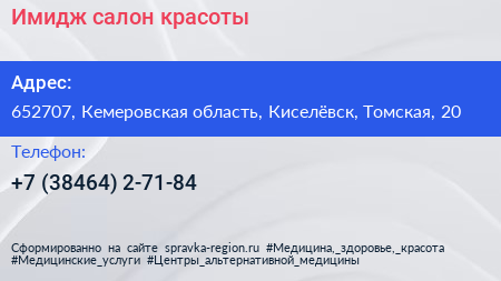 Имидж, салон красоты по адресу 652707, Кемеровская область, Киселёвск, Томская, 20 в дальнейшем Организация, размещена в следующих категориях: