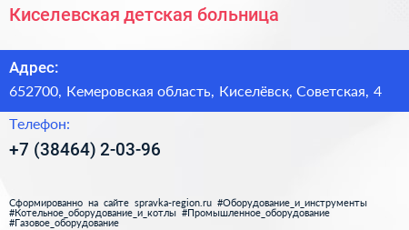 Киселевская детская больница по адресу 652700, Кемеровская область, Киселёвск, Советская, 4 в дальнейшем Организация, размещена в следующих категориях: