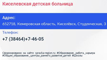 Киселевская детская больница по адресу 652718, Кемеровская область, Киселёвск, Студенческая, 3 в дальнейшем Организация, размещена в следующих категориях: