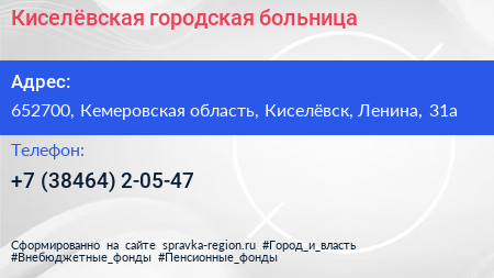 Киселёвская городская больница по адресу 652700, Кемеровская область, Киселёвск, Ленина, 31а в дальнейшем Организация, размещена в следующих категориях: