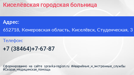Киселёвская городская больница по адресу 652718, Кемеровская область, Киселёвск, Студенческая, 3 в дальнейшем Организация, размещена в следующих категориях: