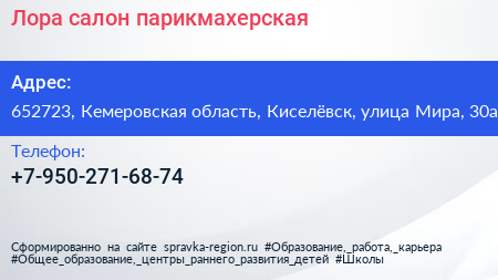 Лора, салон-парикмахерская по адресу 652723, Кемеровская область, Киселёвск, улица Мира, 30а в дальнейшем Организация, размещена в следующих категориях: