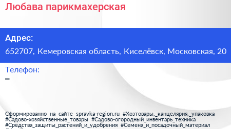 Любава, парикмахерская по адресу 652707, Кемеровская область, Киселёвск, Московская, 20 в дальнейшем Организация, размещена в следующих категориях: