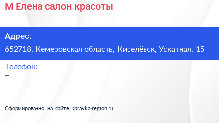 М.Елена, салон красоты по адресу 652718, Кемеровская область, Киселёвск, Ускатная, 15 в дальнейшем Организация, размещена в следующих категориях: