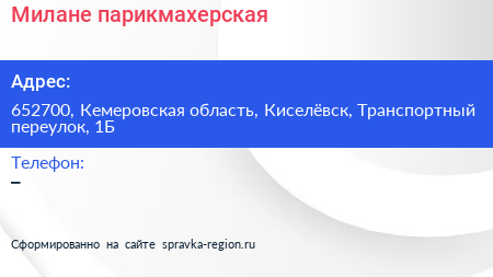 Милане, парикмахерская по адресу 652700, Кемеровская область, Киселёвск, Транспортный переулок, 1Б в дальнейшем Организация, размещена в следующих категориях: