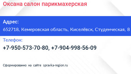 Оксана, салон-парикмахерская по адресу 652718, Кемеровская область, Киселёвск, Студенческая, 8 в дальнейшем Организация, размещена в следующих категориях: