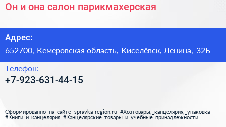 Он и она, салон-парикмахерская по адресу 652700, Кемеровская область, Киселёвск, Ленина, 32Б в дальнейшем Организация, размещена в следующих категориях:
