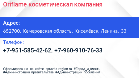 Oriflame, косметическая компания по адресу 652700, Кемеровская область, Киселёвск, Ленина, 33 в дальнейшем Организация, размещена в следующих категориях: