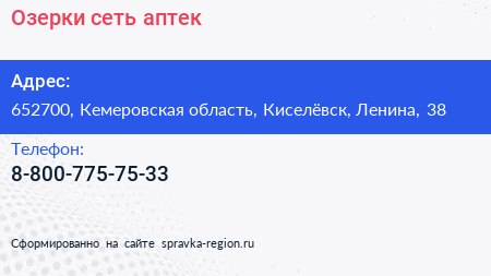 Озерки, сеть аптек по адресу 652700, Кемеровская область, Киселёвск, Ленина, 38 в дальнейшем Организация, размещена в следующих категориях: