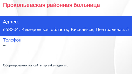 Прокопьевская районная больница по адресу 653204, Кемеровская область, Киселёвск, Центральная, 5 в дальнейшем Организация, размещена в следующих категориях: