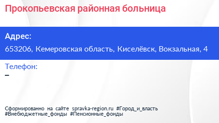 Прокопьевская районная больница по адресу 653206, Кемеровская область, Киселёвск, Вокзальная, 4 в дальнейшем Организация, размещена в следующих категориях: