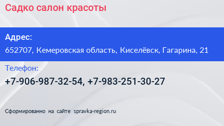 Садко, салон красоты по адресу 652707, Кемеровская область, Киселёвск, Гагарина, 21 в дальнейшем Организация, размещена в следующих категориях: