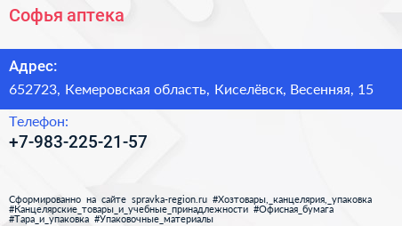 Софья, аптека по адресу 652723, Кемеровская область, Киселёвск, Весенняя, 15 в дальнейшем Организация, размещена в следующих категориях: