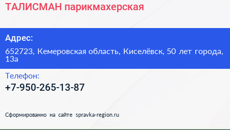 ТАЛИСМАН, парикмахерская по адресу 652723, Кемеровская область, Киселёвск, 50 лет города, 13а в дальнейшем Организация, размещена в следующих категориях: