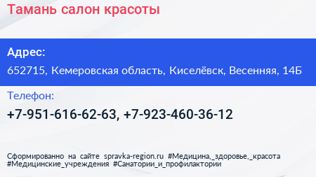 Тамань, салон красоты по адресу 652715, Кемеровская область, Киселёвск, Весенняя, 14Б в дальнейшем Организация, размещена в следующих категориях:
